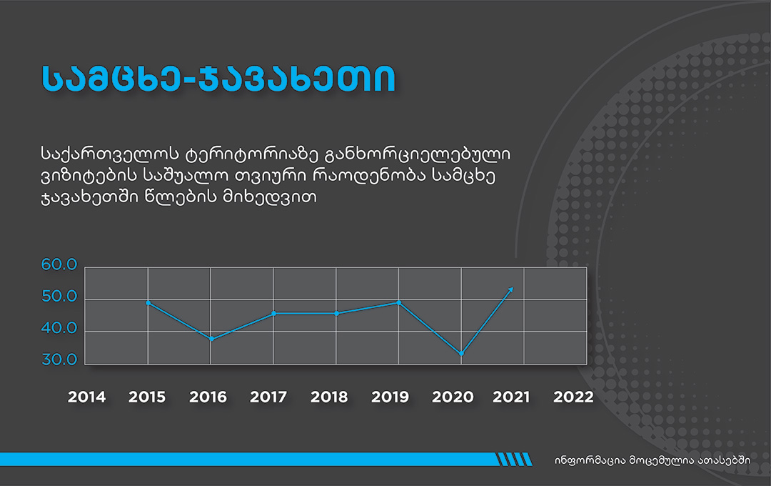 2021 წლის პირველ სამ კვარტალში სამცხე-ჯავახეთში ვიზიტების საშუალო რაოდენობა 29%-ით არის გაზრდილი, მართალია ბოლო მონაცემების პროგრესი 2020 წლის პანდემიით გამოწვეულ ეკონომიკურ კრიზისთან არის დაკავშირებული, თუმცა 2021 წლის თვიური საშუალო მაჩვენებელი, რაც ამჟამინდელი მონაცემებით 53.3 ათასია, ისტორიულ რეკორდს წარმოადგენს.